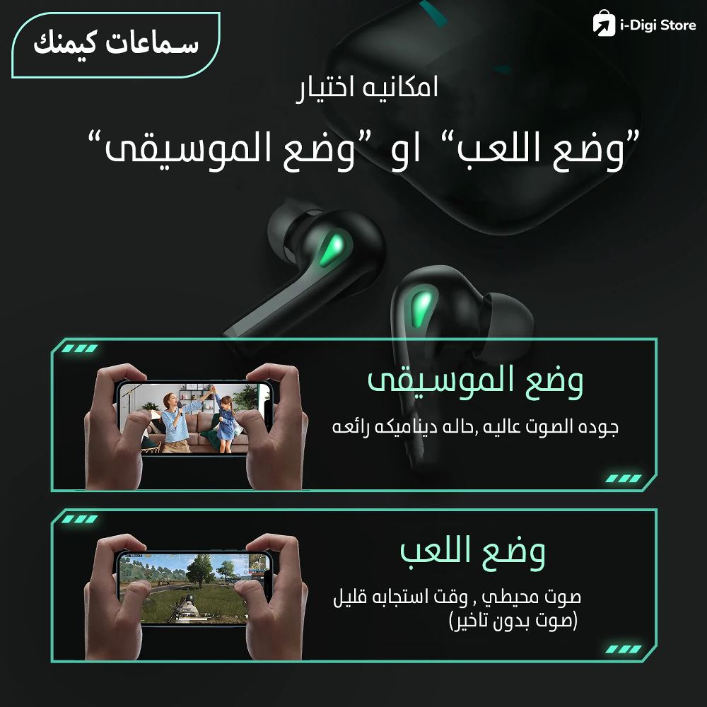 سماعات ايربودز وايرليس احترافية للالعاب مع خاصية اختيار وضع اللعب او الموسيقى. تعمل لمدة 18 ساعة متواصله وتستقبل شحن لاسلكي ايضاً. تربط بخاصية البلوتوث 5.0 مع وقت استجابه اقل من 65 ملي ثانية!